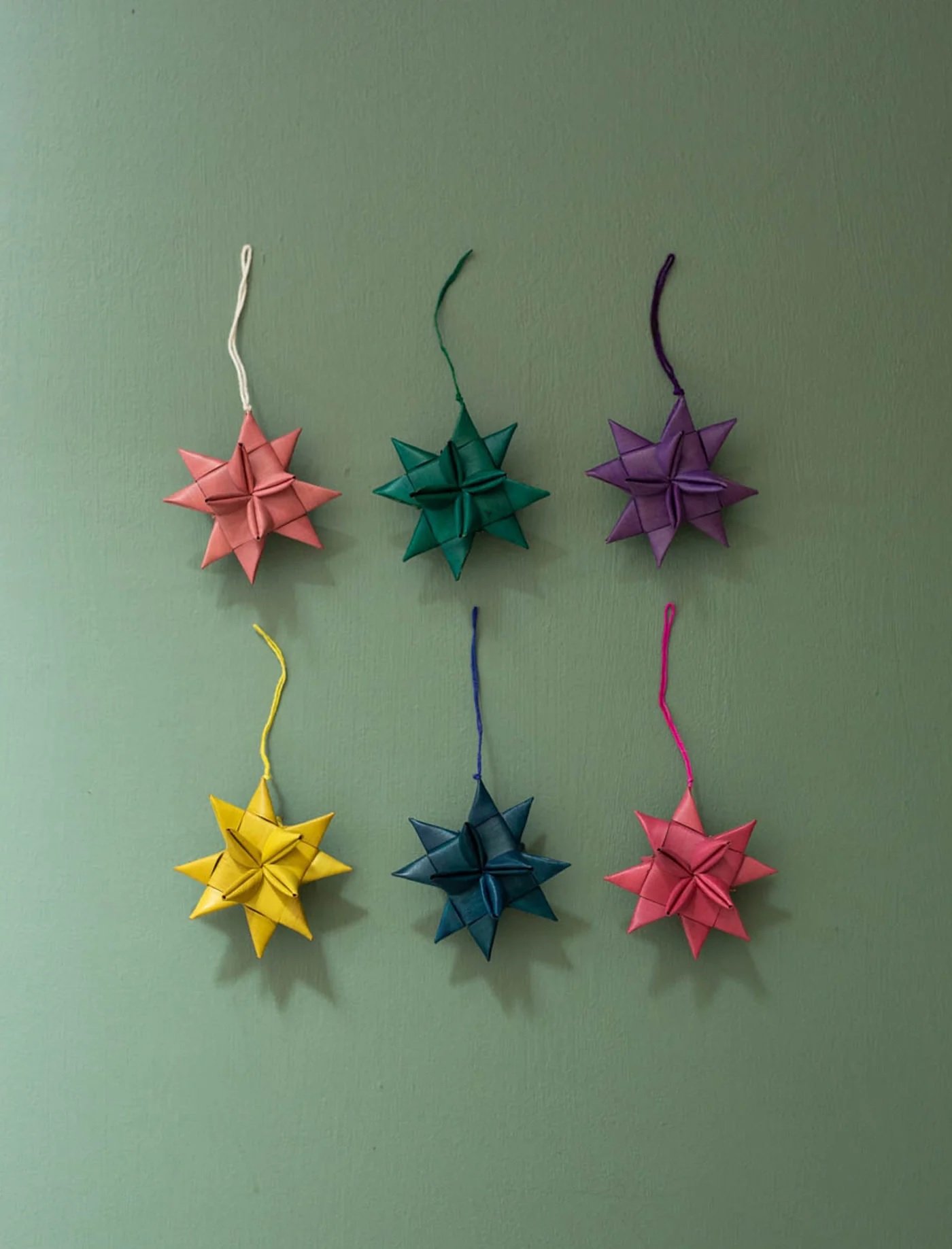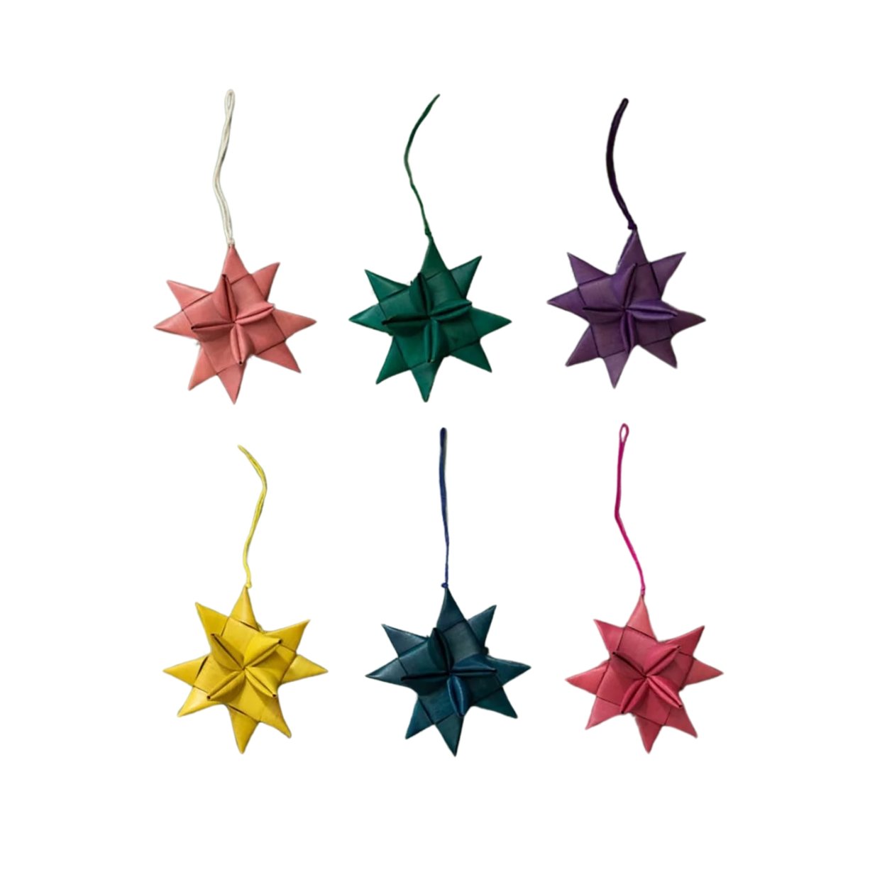 This set of six charming decorations is handcrafted from woven palm and accented with cotton string, both skillfully created by talented artisans.