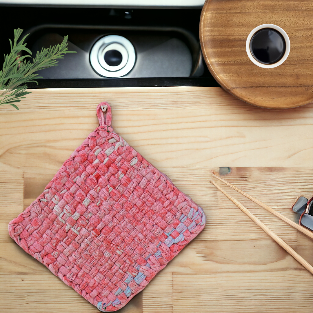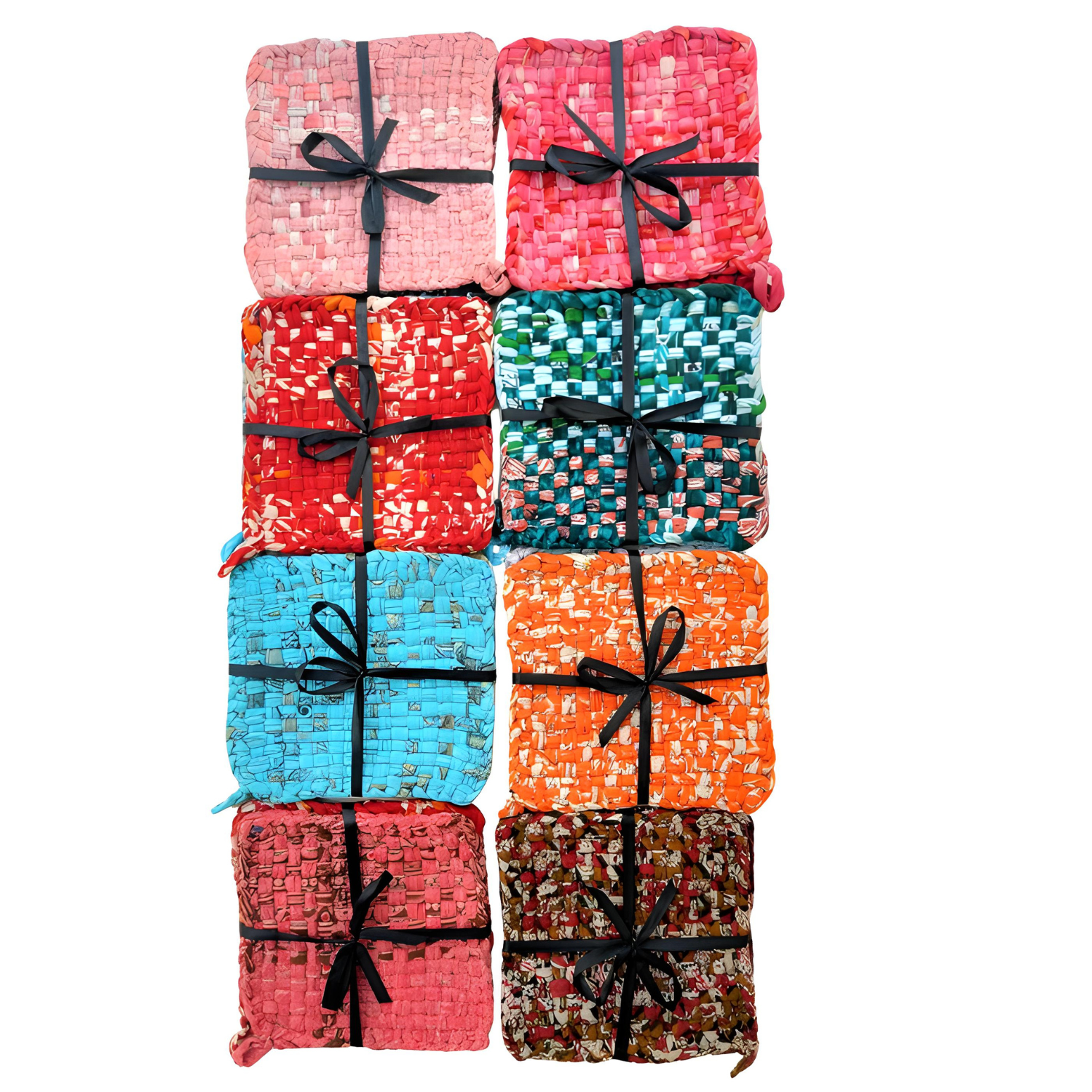 Brighten your dining table with our unique handmade potholders, crafted from recycled saris for a touch of eco-friendly elegance.